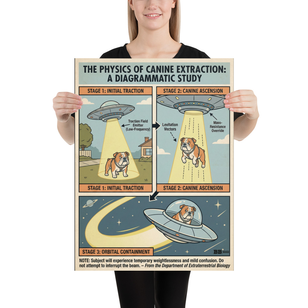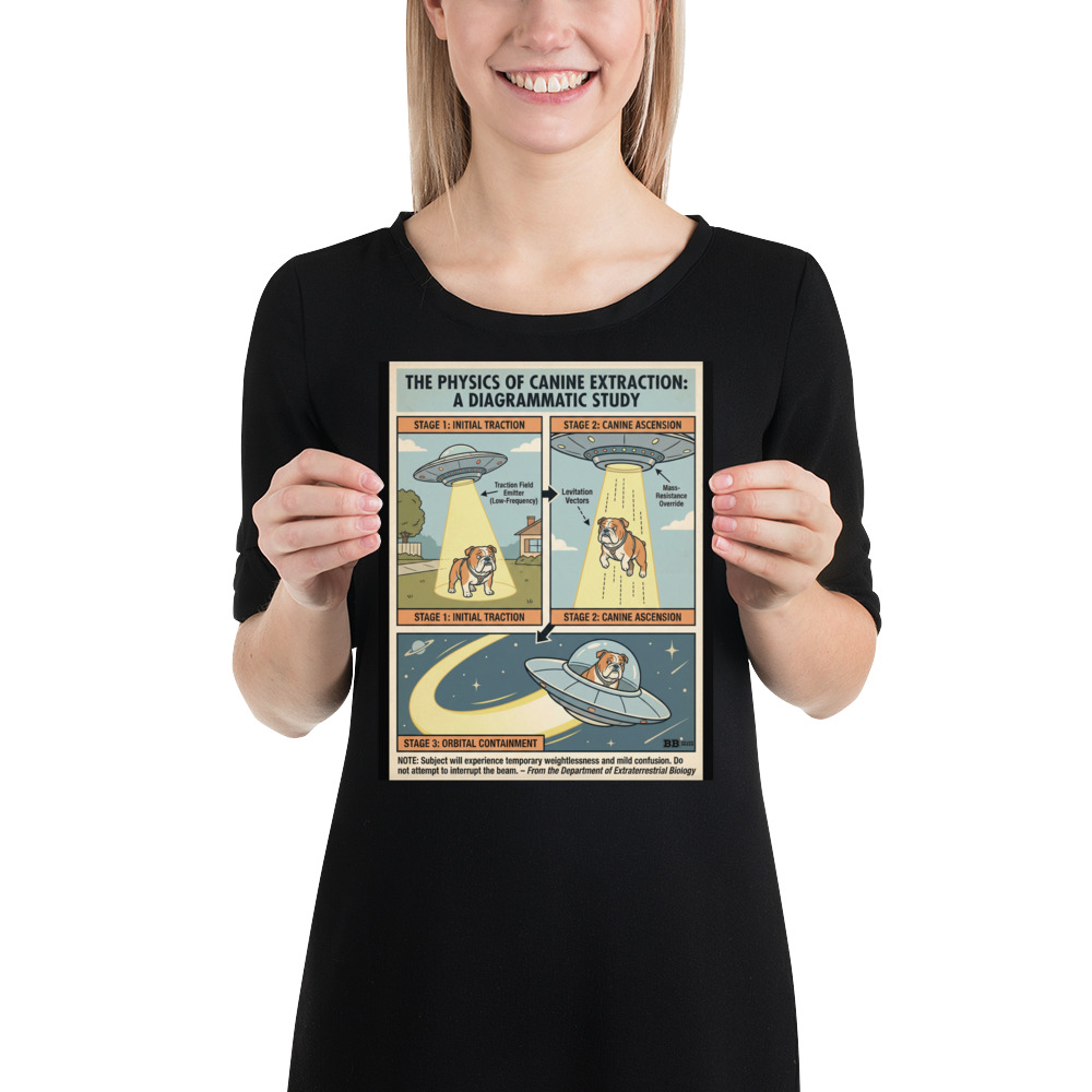 Add a touch of intelligent humor and retro science flair to your space with this unique English Bulldog poster. Inspired by vintage educational diagrams and classic UFO lore, this artwork turns an absurd idea into a perfectly serious “scientific study.” Ideal for offices, studios, living rooms, or anywhere that could use a conversation starter with character.